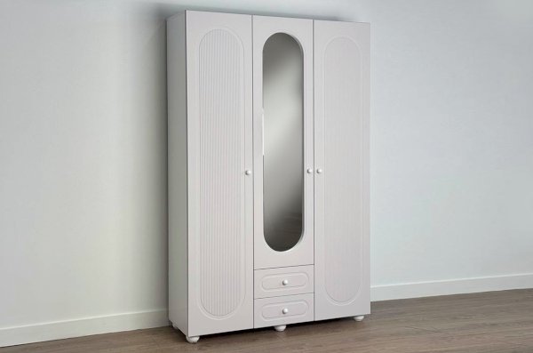 Шкаф оснащён тремя распашными дверями: две крайние двери выполнены из МДФ, а средняя дверь дополнена зеркалом, которое визуально расширяет пространство и делает комнату светлее. В нижней части предусмотрены два выкатных ящика, подходящих для хранения белья, аксессуаров или повседневных вещей.