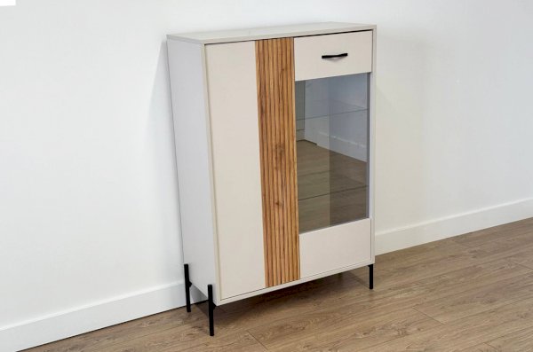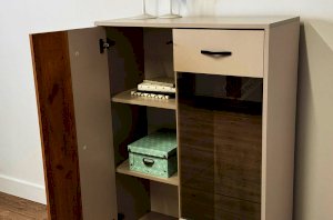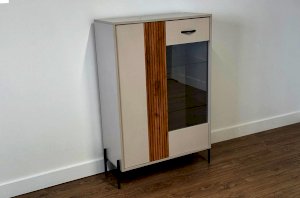 Другая сторона комода оснащена выкатным ящиком и фасадом со стеклом, обладающим зеркальным эффектом. Это не только добавляет современности и шарма, но и обеспечивает дополнительное пространство для хранения декоративных предметов и книг.