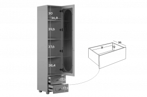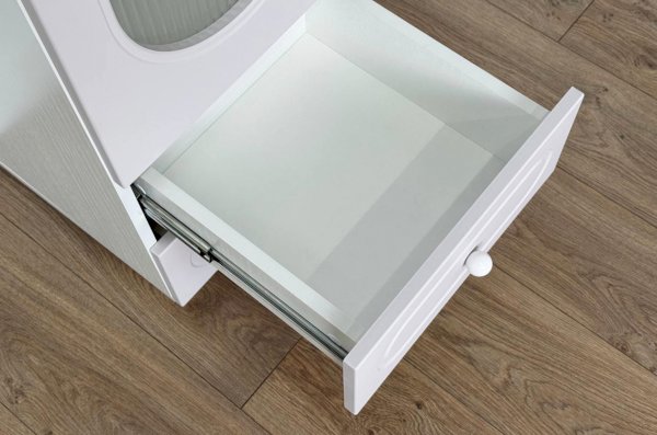 Модель оснащена одной распашной дверцей с вставкой из прозрачного рифлёного стекла, а также двумя вместительными выкатными ящиками в нижней части для хранения одежды, текстиля или аксессуаров. Внутреннее наполнение можно выбрать в зависимости от задач: шкаф комплектуется полками или штангой для плечиков, что позволяет адаптировать его под разные потребности.